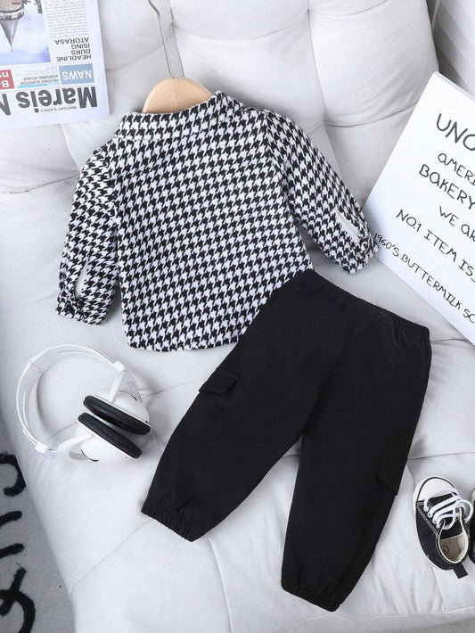 طقم ملابس أولاد من بلايفول بالز - جاكيت أنيق بنقشة مربعات هاوندستوث + بنطال أسود متناسق، طقم أنيق وعصري لفصلي الربيع والخريف