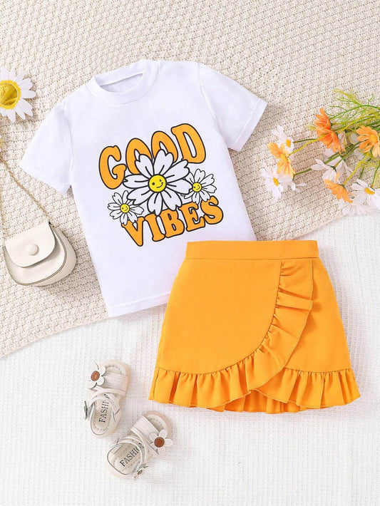 Floral Dreams: Girl's Graphic Tee & Ruffle Trim Skirt Set