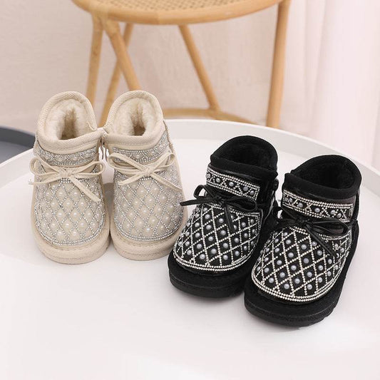 Bottes d'hiver pour filles : Douces et chaudes, antidérapantes, avec patch ours.