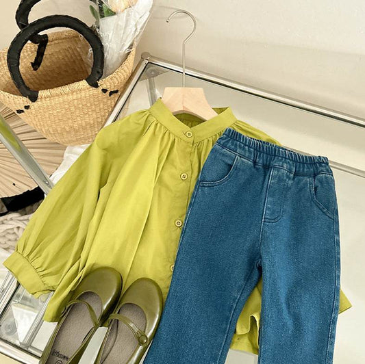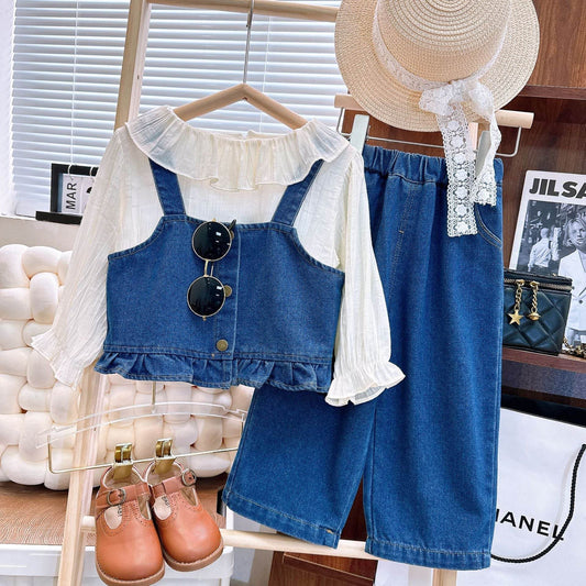 Ensemble de tenues élégantes pour filles - chemise à col volanté avec jean et veste à la mode