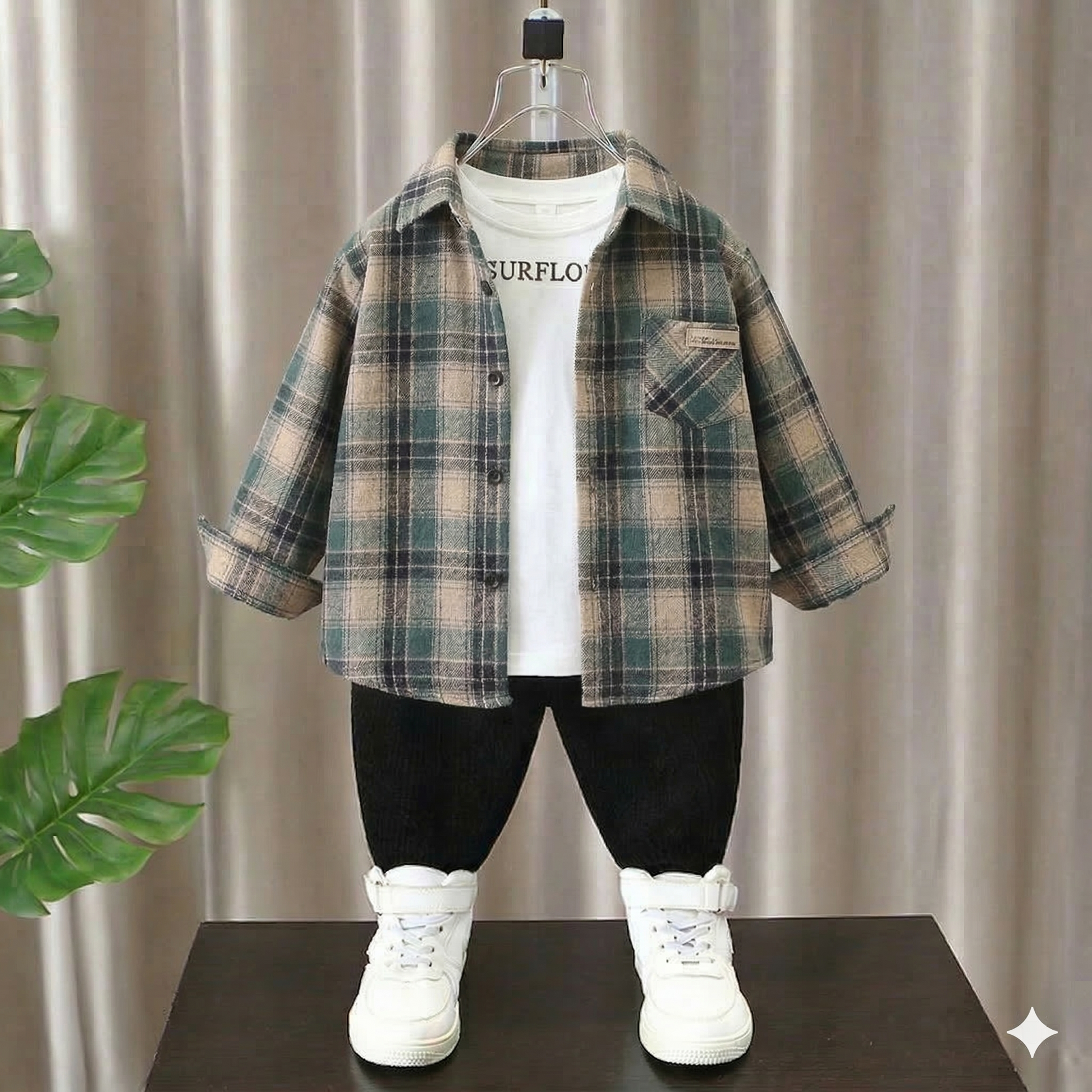 طقم ملابس للأولاد مكون من 3 قطع: قميص فلانيل كاروهات عصري، تيشيرت مطبوع عليه شعار SURFLO، وبنطال رياضي.
