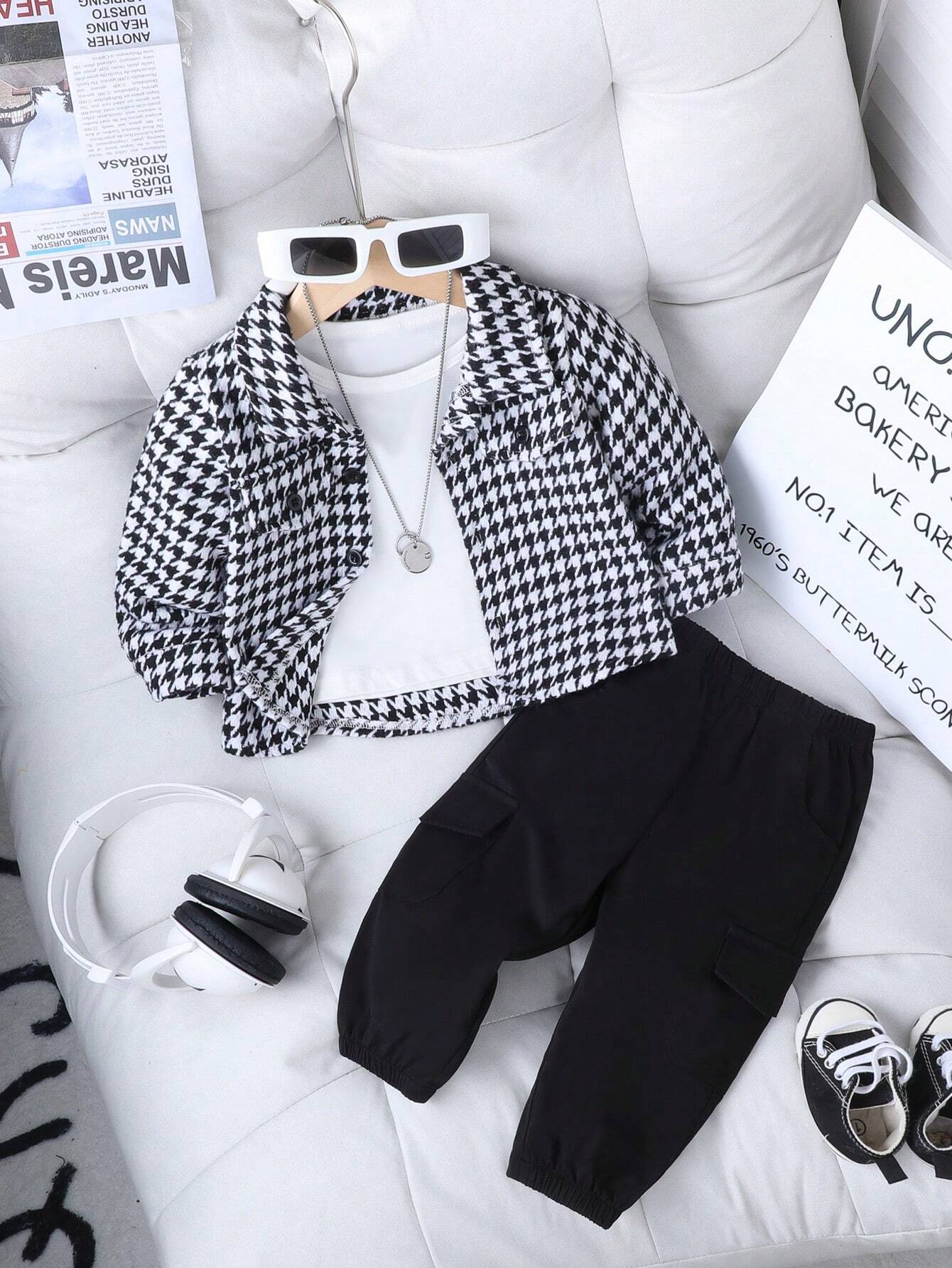 طقم ملابس أولاد من بلايفول بالز - جاكيت أنيق بنقشة مربعات هاوندستوث + بنطال أسود متناسق، طقم أنيق وعصري لفصلي الربيع والخريف